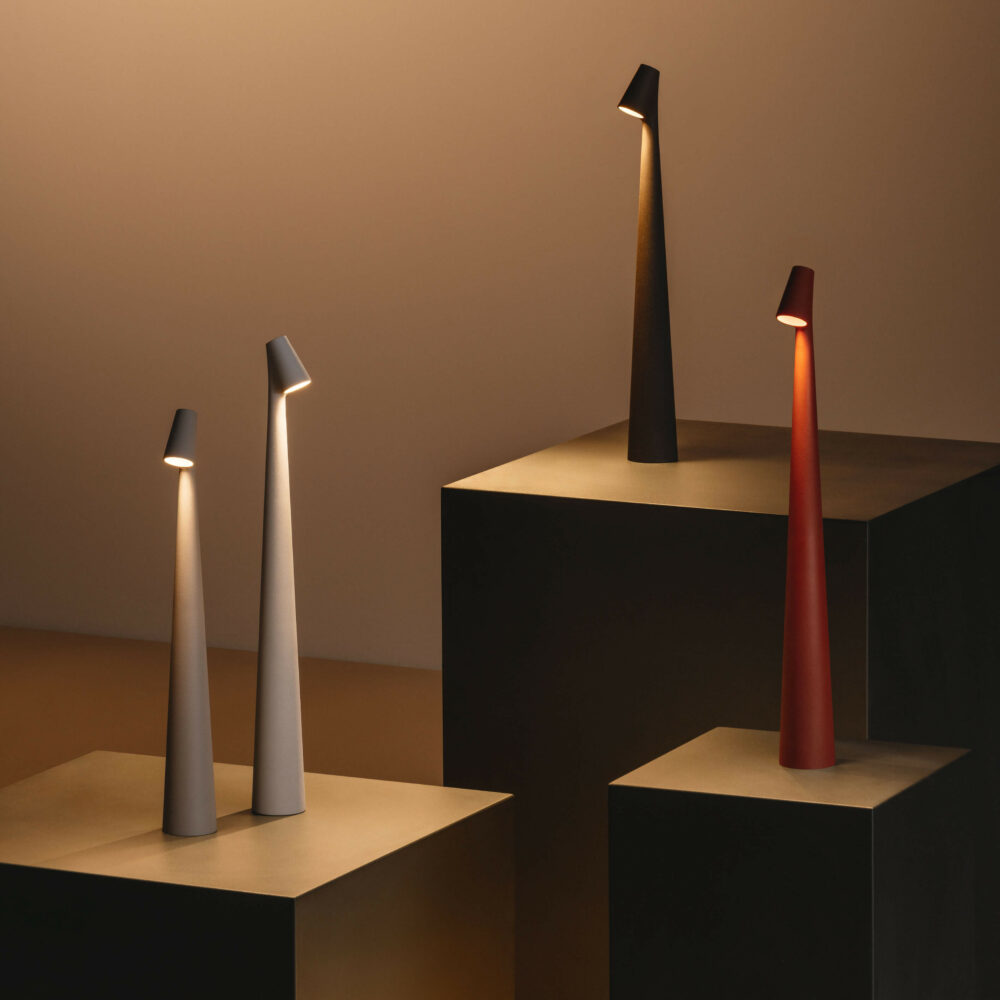 Disponibile in due dimensioni, Africa presenta una finitura laccata opaca e quattro tonalità naturali, che conferiscono calore e solidità al design. La sorgente LED ricaricabile offre tre livelli di intensità, facilmente regolabili tramite un pulsante sulla testina, permettendo di adattare la luce alle diverse esigenze e creare atmosfere personalizzate.